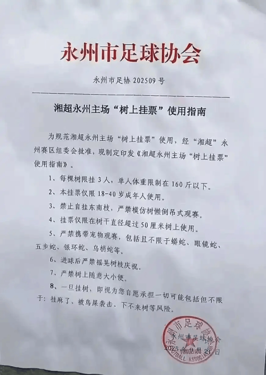 网友所发视频显示,“湘超”永州VS湘潭的比赛期间,部分买不到票的球迷自发爬树观赛。此外,在网上还流传着一份《湘超永州主场“树上挂票”使用指南》:每棵树限挂3人,单人体重不超过160斤;仅限18至40岁成年人;严禁模仿树懒倒吊;严禁携带蟒蛇、眼镜蛇、五步蛇、银环蛇等宠物观赛;严禁在树上大小便;参与者需承担“挂麻了、被鸟屎袭击、下不来树”等意外风险……
