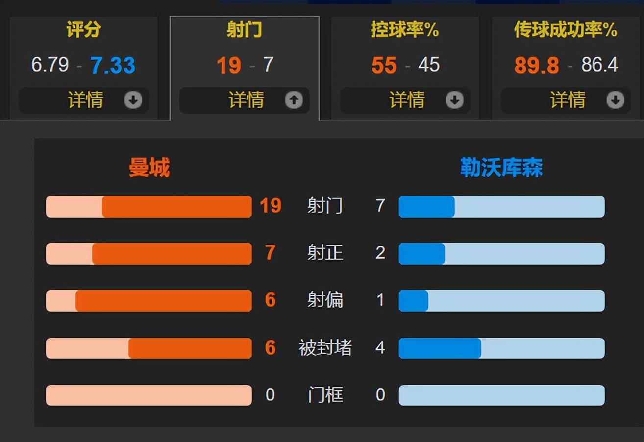 全场比赛,曼城的控球率为55%,一共有19次射门,其中7次射正;勒沃库森一共有7次射门,其中2次射正。返回搜狐,查看更多