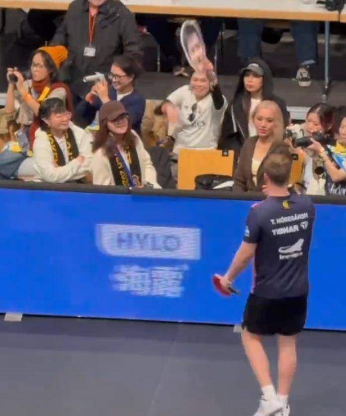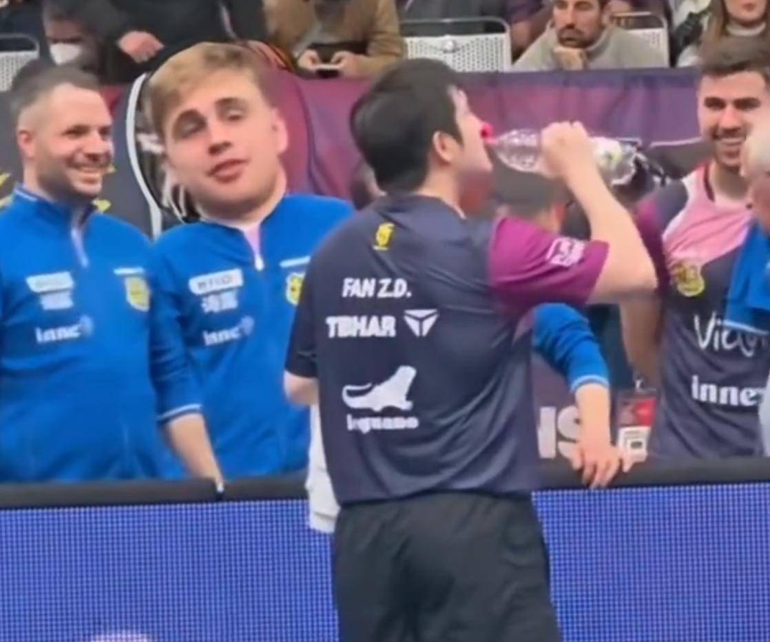 他刻意模仿着那位中国巨星标志性的发球前凝视姿势,夸张地还原其反手暴冲时转腰蹬腿的发力形态,甚至举着牌子满场跑动,学起了大范围救球的交叉步。 他一边表演,一边不断朝着萨尔布吕肯俱乐部休息区的方向高喊“Fanni”——这是樊振东在队内的昵称。