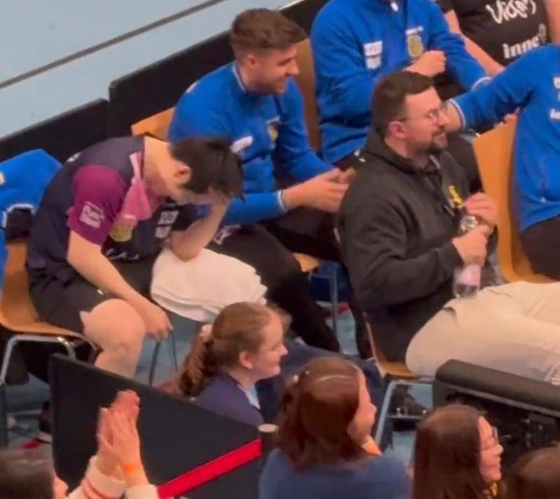 镜头迅速切向被模仿的本尊。 坐在板凳上的樊振东,看到自己幼年时圆润稚嫩的面孔被队友如此“活用”,瞬间的反应是错愕,紧接着便是无法抑制的笑意。他多次用手掌捂住脸,低下头试图藏起表情,但通红的耳朵和疯狂上扬的嘴角早已出卖了他。最终,他索性转过身去,背对球场,肩膀因为强忍笑声而不停地抖动。 现场的观众席爆发出持续的尖叫与哄笑,甚至连裁判都因为无法正常计分而一度暂停了比赛。
