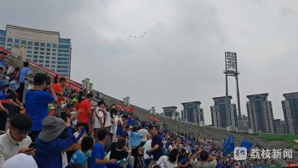 比赛开始前,五架飞机从扬州体育公园体育场上空飞过,引燃全场激情,在球迷呐喊中,比赛正式开始。据了解,这五架轻型运动飞机来自江苏一家民营通用航空公司,企业负责人是一名球迷,也是航空爱好者,这次飞行是他们例行训练,航线恰好经过扬州体育公园上空。