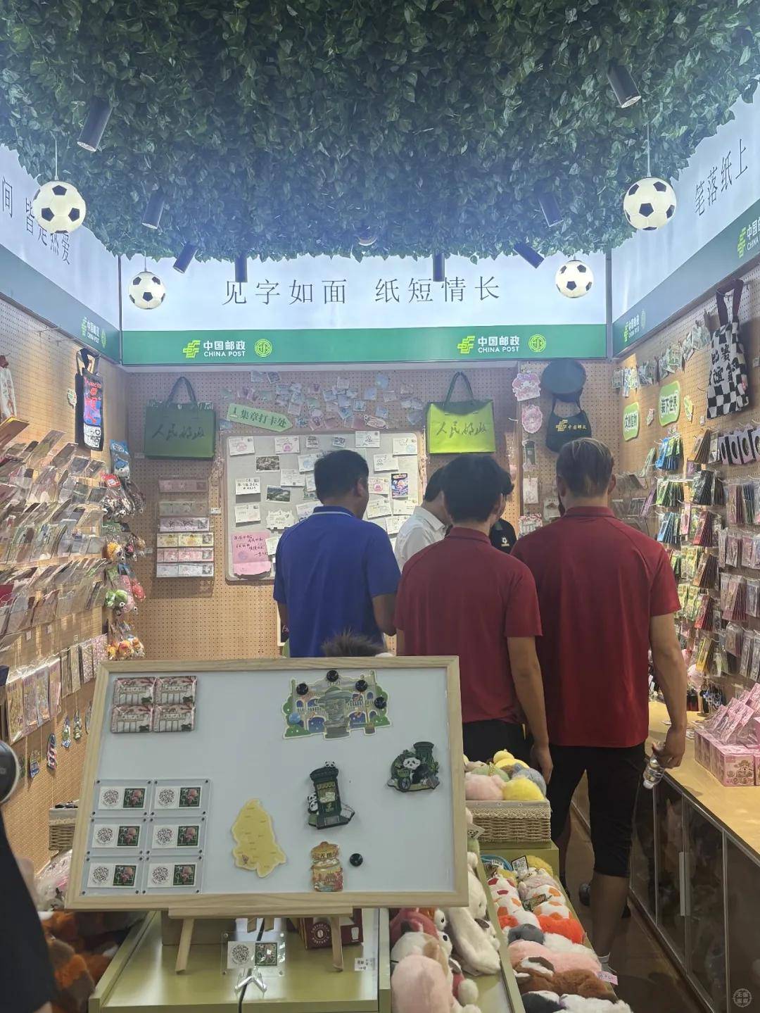 随后,队员们来到足球邮局文创商店内,这里汇集了众多足球特色文创产品,大家一边观赏球衣、钥匙扣等“苏超”主题周边产品,一边互相交流球队比赛情景,脸上洋溢着笑容。