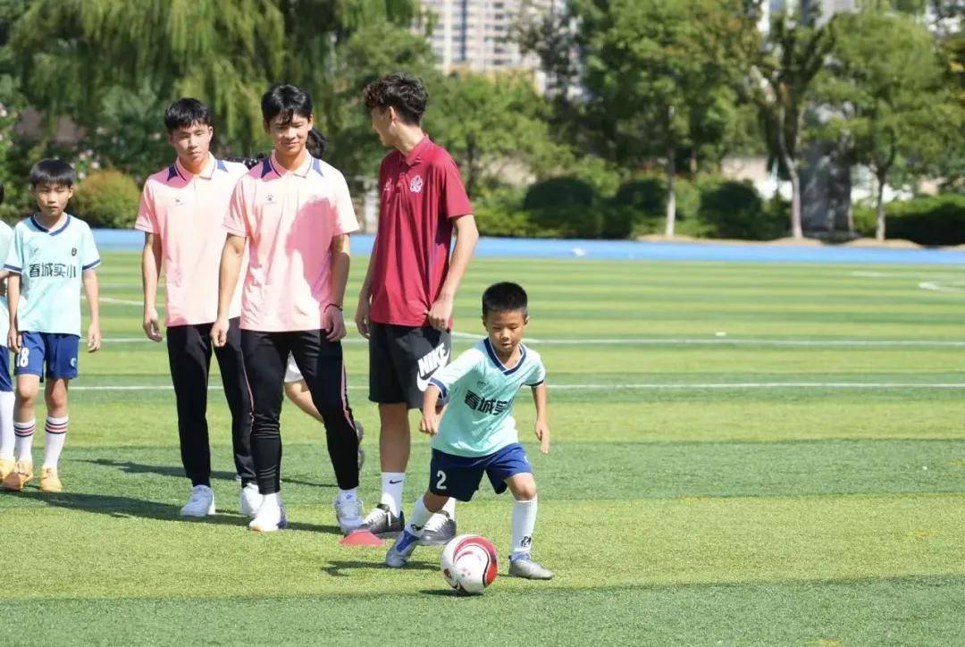 “苏超”无锡队的助理教练赵鹏带领着胡升嘉、周宇、李皓然、同乐、康乐强、张午、郑波、缪凌等滨湖球员如约而至,在师生们的鲜花与掌声中,身着统一队服的球员与学校足球队的孩子们踢球互动。