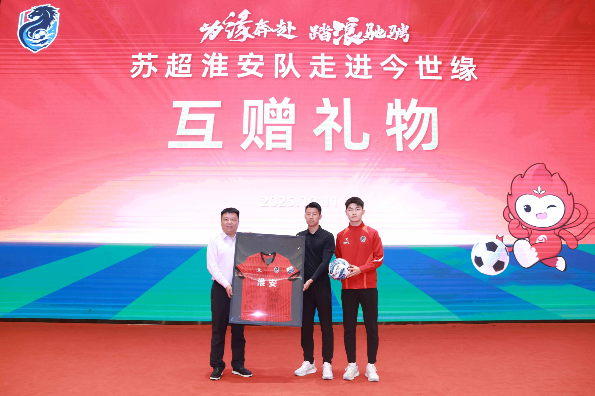 交流会上,暖意融融,淮安队向今世缘酒业赠送淮安队签名足球、球衣,将赛场上的热血记忆定格为珍贵联结;今世缘酒业向淮安队赠送今世缘“事事如意”珍藏纪念酒,以酒为媒传递“缘”的美好祝愿。