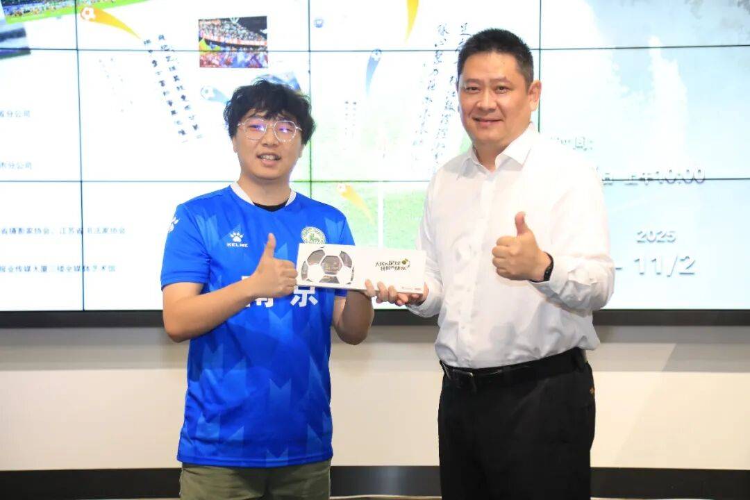 南京邮政党委委员、副总经理沈峰(右)为幸运球迷现场赠送实体“苏超”明信片