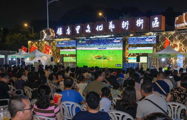 10月4日,球迷在南京市建邺区银杏里文化艺术街区的“苏超”“第二现场”观赛。新华社记者 李博 摄