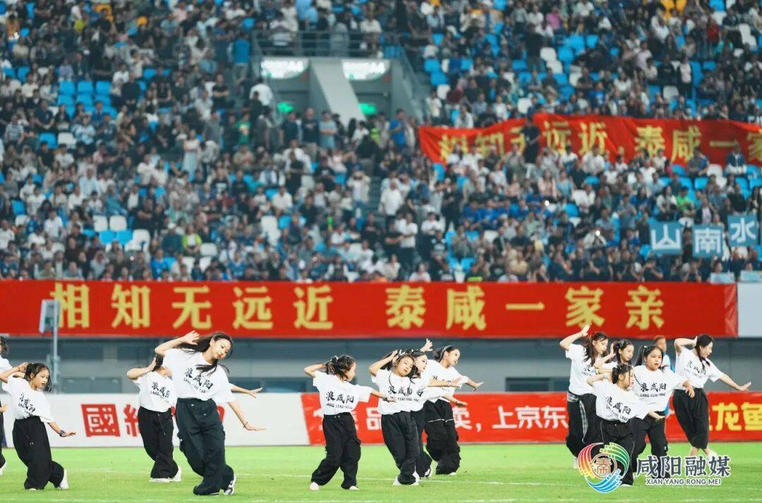 9月20日,在泰州队主场对阵南京队的比赛期间,咸阳专门安排助场展演,献上高亢激昂的陕派摇滚《浪咸阳》。旌旗舞阵威风凛凛,搭配萌趣十足的“秦嘟嘟”人偶互动,瞬间点燃全场气氛,为泰州队注入强劲精神动力。足球看台上,咸阳球迷助威团打出的“相知无远近,泰咸一家亲”“群咸毕至,泰州加油”“山南水北,咸阳很美”等标语,与泰州球迷的呐喊声交织共鸣,成为赛场边最动人的风景线。