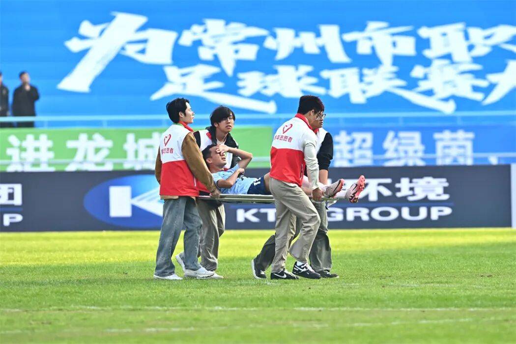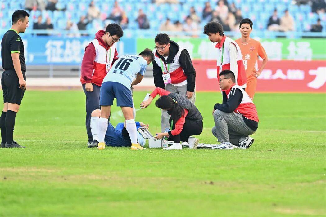 “快,这边球员受伤了!”11月15日,“常超”决赛现场,一名球员在拼抢中不慎摔倒,腿部擦伤。场边医疗组工作人员闻声而动,立即携带急救箱冲向受伤球员,一场紧张的现场救治迅速展开。