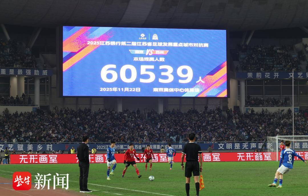 作为“苏超”的续集,本场比赛有60539名球迷现场观赛。此外,江苏培养的中国女排两任队长、2016里约奥运会冠军惠若琪、张常宁以及2024巴黎奥运会花样游泳冠军王赐月前来观赛。此外,在刚刚落幕的第十五届全运会上斩获金牌的江苏女足运动员代表以及十五运摔跤冠军洪可新、柔道冠军王江南等也受邀来到南京奥体观看这场比赛。