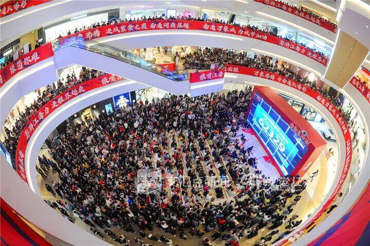 11月1日 南通“苏超”决赛,市民、球迷在位于南通市崇川区唐闸镇街道的一处商场观看比赛直播。大屏显示,决赛现场南京奥体中心体育场观众人数再创新高。陈俨 摄