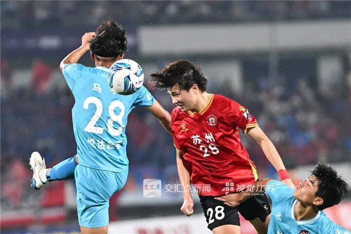 9月7日 苏州“苏超”第11轮,苏州队主场对阵盐城队,苏州队队员在比赛中头球射门。张从余 摄