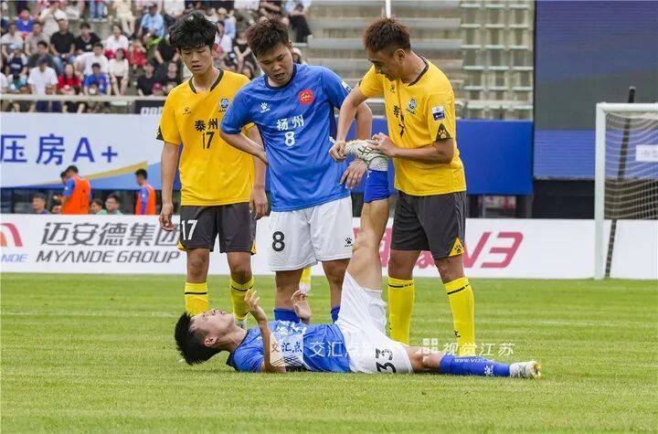6月14日 扬州泰州队队员帮助抽筋的扬州队队员拉伸,诠释友谊第一。顾祥忠 摄