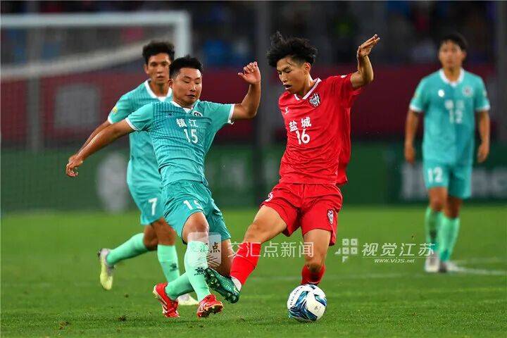 6月28日 盐城“苏超”第5轮,在激烈拼抢中,空调维修工、镇江队许俊杰(左)与“海底捞”兼职服务员、盐城队单伟(右)上演草根球员的对决。万程鹏 摄