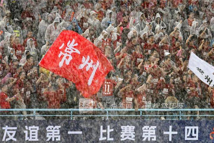 6月21日 常州“苏超”第5轮,3万多名球迷冒着大雨为常州队呐喊助威。从“比赛第一 友谊第十四”玩梗出圈,到常州主场“友谊第一 比赛第十四”的大幅标语,“苏超”玩梗收放自如。吴俊 摄