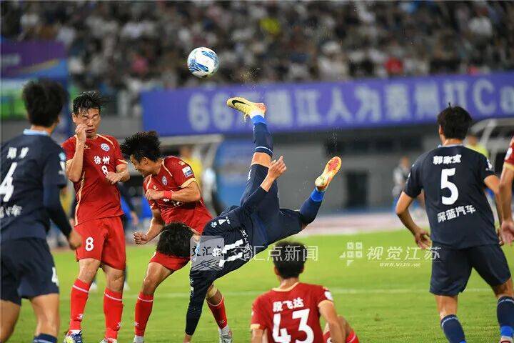 6月29日 泰州“苏超”第5轮,主场作战的泰州队1∶2不敌徐州队,但该队11号球员巴特一记倒钩进球成为“苏超”的一粒“神仙”进球。肖勇 摄