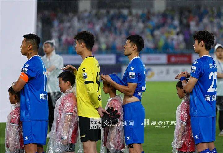 6月21日 常州“苏超”第5轮,常州队在雨中主场对阵南京队。赛前奏国歌时,球员们纷纷用球衣和双手为球童遮雨。冯芃 摄