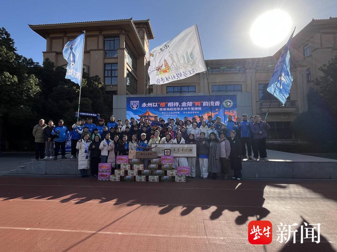 2026苏超还未开打,一块块在湖南永州竖起的助威广告牌和大屏正传递着来自江苏人民的热情,并且助苏超与湘超共赢,这也是永州送橙活动的由来。对于南京站的活动,永州方面非常重视,当地宣传部以及融媒中心也派出相关领导一同护送370箱“冠军橙”及一个龙舟模型抵宁,南京球迷则回礼了盐水鸭、云锦、书法作品和签名球衣。作为东道主,南京球迷高喊:南京欢迎您!而永州球迷则回应:“感谢南京”!两地人员还不断互动,大家共同学会了永州和南京“厉害”的方言,“永州,晓了显火、南京,莱斯!”也成为了现场反复次数最多两句话。