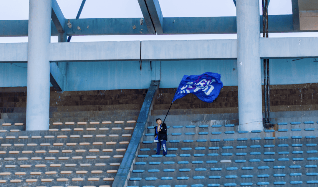 12面巨大的战旗一字排开,居中的是红底黄字的“无锡市”旗。看台最上方是一排刀旗,与前排的大旗相呼应。所有战旗随着战歌节奏上下舞动,气势恢宏。