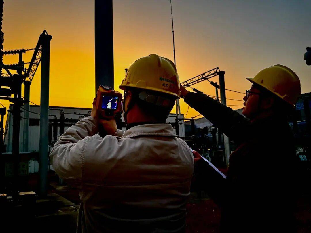 远处,密集的变电设备于夕照下透出“蒸汽时代”般工业美感;近处,工作人员举起测温仪器展现一举一动的现实规范……新春越来越近,他们也越发细致谨慎。